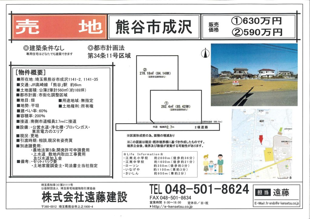 | 別途諸費用 | ・農地法第5条,開発許可申請費用 ・上水道 敷地内取出工事費用及び水道加入金 |