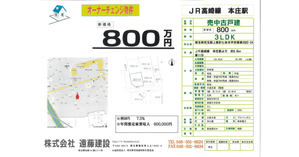 ダウンロードはこちら r7-008ダウンロード 物件概要 所在地埼玉県熊谷市三本1936土地面積807.75㎡(約244坪)建物面積延137.98m(約41.7坪)建物構造木造瓦葺2階建土地権利所有権地目宅地接道状況南側市道に約2.8m接道都市計画市街化調整区域建ぺい率60%容...